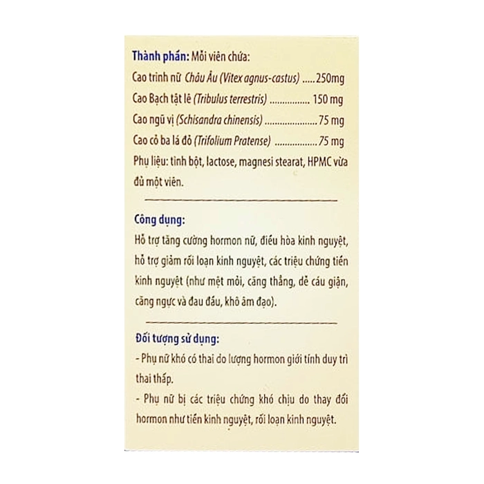 - Hỗ trợ tăng cường hormon nữ, điều hòa kinh nguyệt, hỗ trợ giảm rối loạn kinh nguyệt, các triệu chứng tiền kinh nguyệt (như mệt mỏi, căng thẳng, dễ cáu giận, căng ngực và đau đầu, khô âm đạo).